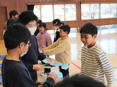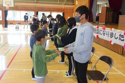 プレゼント贈呈(1・2年生:色紙、3・4年生:ハンカチ)