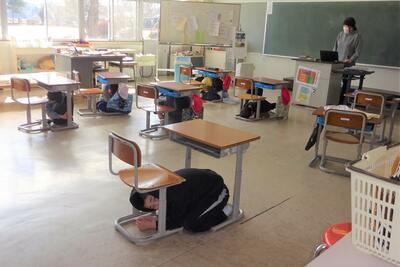 今日は、シェイクアウト訓練を実施しました。地震発生の放送を聞き、子供たちは机の下で頭をおさえて身を守る体勢をとりました。
